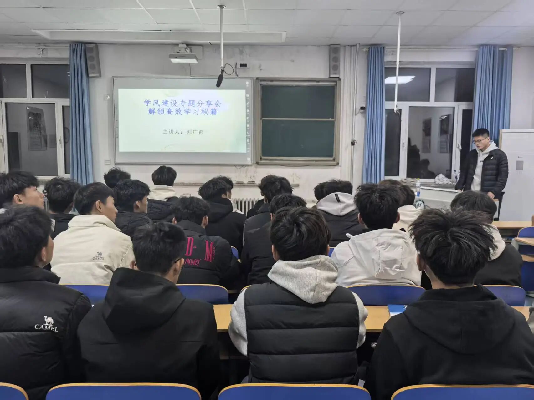 分享会伊始,刘广前结合自身保研经历,从“成绩筑牢基础”“科研竞赛加分”“材料准备技巧”三个维度展开分享。在成绩提升板块,他强调核心专业课的重要性,建议同学们课后3天内完成笔记复盘,确保知识消化;谈及科研竞赛,他详细讲解了如何筛选适合自己的项目、高效推进研究进程;针对材料准备,他提醒大家提前整理学术成果、打磨个人陈述,避免因细节疏漏错失机会。分享过程中,同学们认真记录要点,现场互动频繁,师哥也耐心解答了“如何平衡学习与竞赛”“跨专业保研注意事项”等问题。